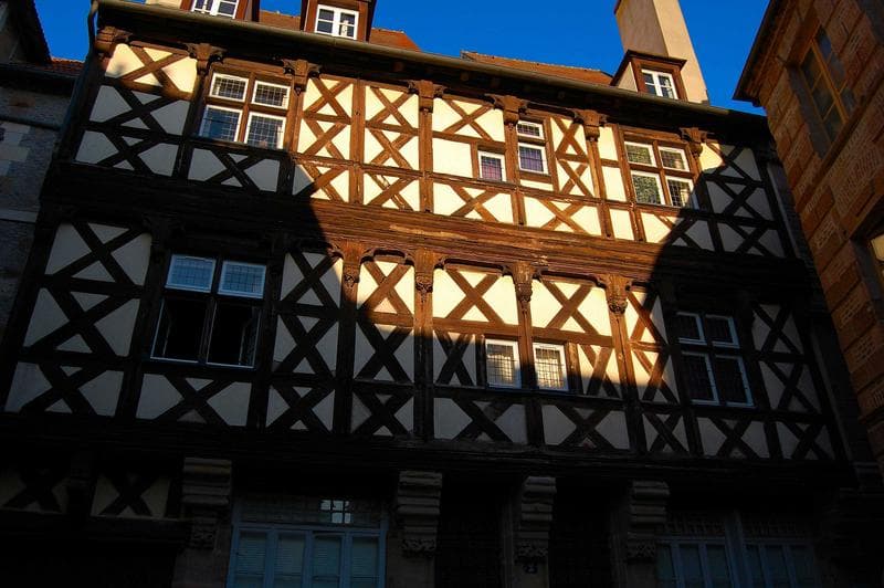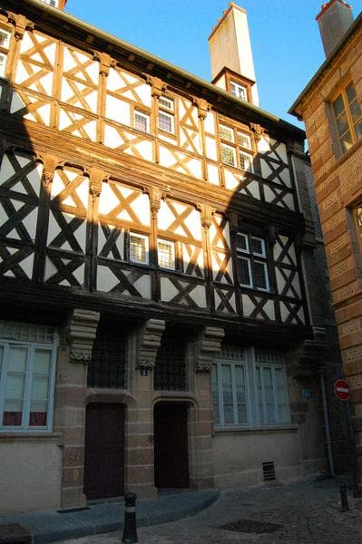 Exemple de l'architecture civile du 15e siècle dans la capitale du Bourbonnais, avec corbeaux de pierre sculptés, armature de bois croisillonnée en façade, et encorbellement du second étage appuyé sur des supports terminés en pendentifs et reliés entre eux par des arcs. A l'intérieur de la cour, tourelle d'escalier à vis avec porte à accolade flanquée de pinacles.