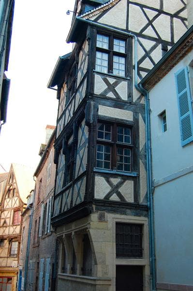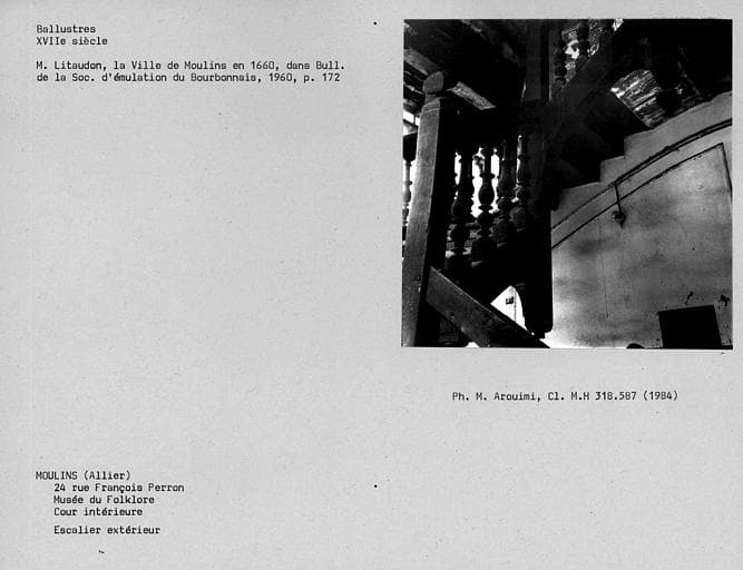 Maison, rue des Orfèvres : 15e siècle ; Maison, place de l'Ancien-Palais : 17e siècle. L'immeuble faisait partie du groupe des maisons de ban dans lesquelles le duc de Bourbon faisait vendre ses vins. La maison comprend un escalier en bois, rare exemple d'escalier en bois à balustres moulurés subsistant à Moulins. Il est disposé autour d'un noyau creux, dans une cage rectangulaire entièrement ouverte sur l'extérieur, et dont la charpente repose sur les poteaux d'ossature. La balustrade et la main courante se prolongent sur les galeries d'étages.