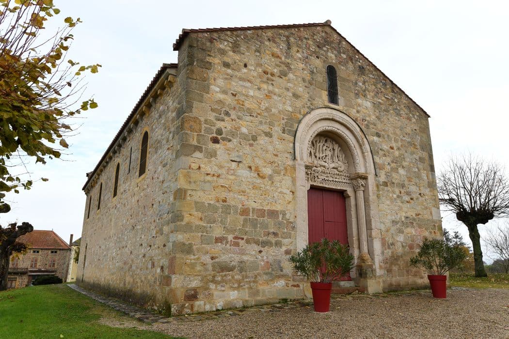 Eglise romane formée d'une nef voûtée d'arêtes en plâtre, sans bas-côtés, et terminée par une abside en cul-de-four précédée d'une travée droite. Un clocher arcade s'élève sur le pignon est de la nef. Les anciennes baies romanes ont été murées. A l'extérieur, portail avec archivolte plein cintre surhaussé, retombant sur colonnettes. Chapiteaux historiés et tympan sculpté. Le tympan présente une adoration des mages cantonnée du tétramorphe et de quatre anges. Le linteau présente également des scènes sculptées : Adam et Eve ; Madeleine essuyant les pieds du Christ avec ses cheveux ; la Cène.
