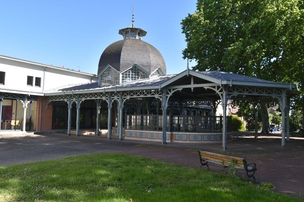 La source Lardy, du nom de son inventeur, fut exploitée à partir de 1848, peu après sa découverte (1844). Les pavillons primitifs étaient de petits édifices en bois recouverts de chaume. Le pavillon actuel a été édifié en 1900. Edifice en bois de plan rectangulaire, terminé au nord par trois pans. L'ensemble repose sur treize piliers de bois. A l'intérieur, un mur clôt les sources et supporte une verrières à petits bois. L'ensemble a un plan en U. Intérieurement et extérieurement, le mur est recouvert de carreaux de faïences aux couleurs bleu, jaune, vert et or. A l'intérieur, deux parties sont délimitées par une différence de niveau, matérialisée par un escalier et une grille en fer forgé. Dans chacune d'elles, un bassin circulaire contenait la source, recouvert de carreaux de faïence de même couleur que les murs extérieurs. La source du fond était protégée par une cloche de verre. A son aplomb a été élevé un dôme hexagonal, couvert en écailles et terminé par un lanternon. Ce pavillon est, à Vichy, l'un des derniers vestiges de ces constructions en bois, architecture de jardin dans la tradition des fabriques.