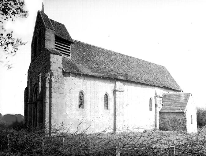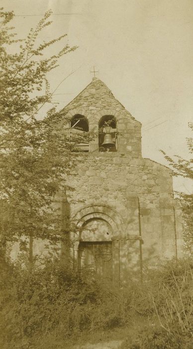 Eglise des 11e et 12e siècles, ouverte au sud par une porte au linteau en accolade ajoutée au 15e siècle. L'édifice comprend une nef de deux travées, terminée par un choeur de deux travées et un chevet plat. Une charpente a remplacé les berceaux en plein cintre primitifs. La façade est surmontée d'un clocher-mur à deux baies. L'entrée primitive s'effectuait à l'ouest par un portail dont l'ouverture rectangulaire est accostée de deux colonnes dont les chapiteaux de feuillages à enroulements supportent le rouleau inférieur de l'arc en plein cintre inscrivant le tympan nu. Les vantaux de ce portail roman ont conservé leurs pentures. Les ferronneries de cette porte représentent des courbes, des têtes de serpents, des feuilles lancéolées, et une représentation humaine stylisée.