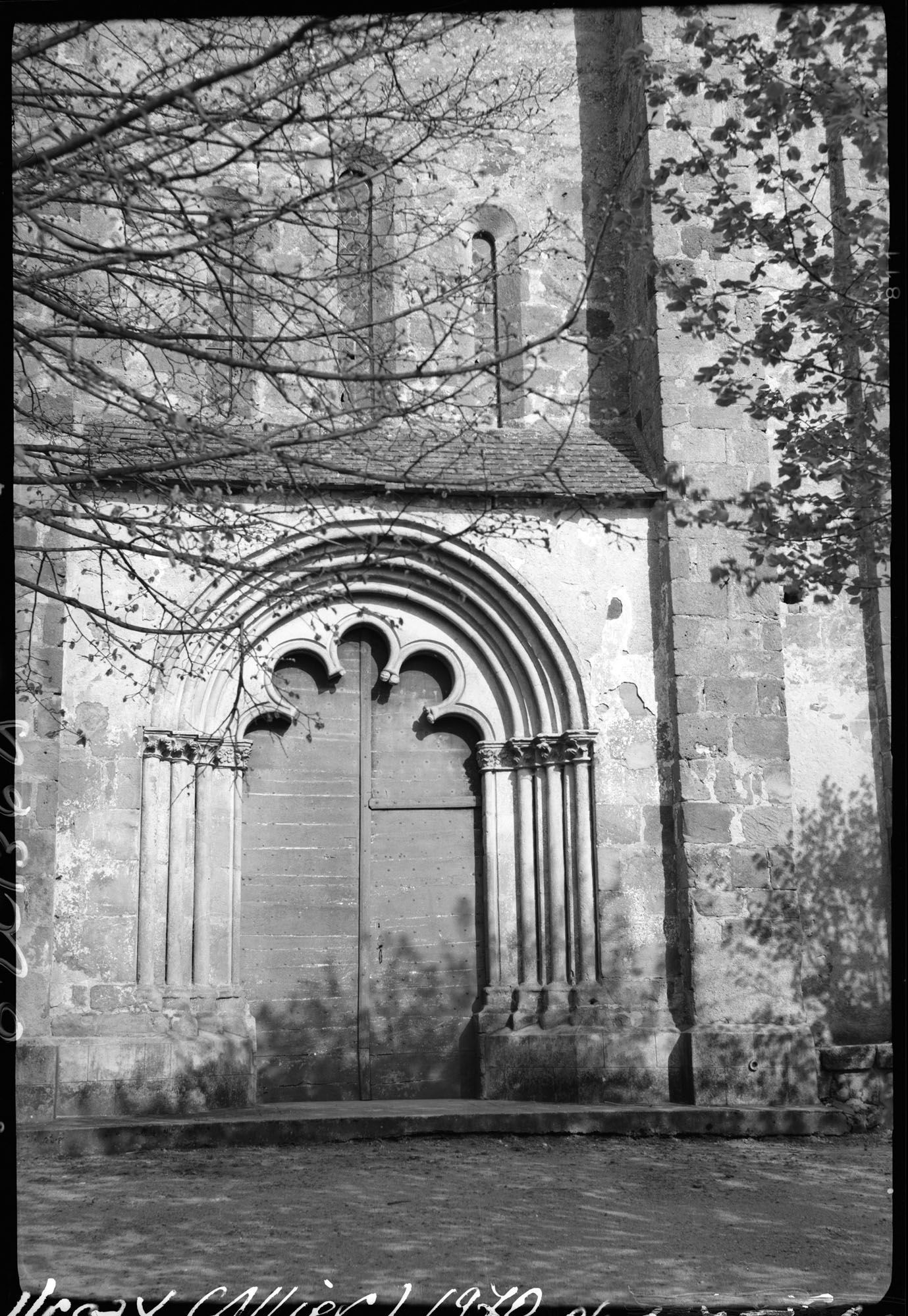 Eglise construite du 11e au 15e siècle, la campagne principale se situant au 13e siècle et correspondant à une reconstruction de l'édifice sur les bases d'un édifice roman. L'église comprend un choeur à chevet plat, accoté d'une nef composée de deux travées, à l'aplomb de laquelle s'élève le clocher. Le choeur, d'origine romane, est couvert par un berceau plein cintre. Chaque mur latéral est percé de deux profondes arcadres plein cintre formant chapelles. Une grande baie d'axe perce le chevet plat. La nef est voûtée d'ogives à profil torique. Les piles séparant les deux travées sont cruciformes, cantonnées de colonnes à chapiteaux ornés de feuillages découpés et de crochets parfois terminés par des têtes. Les bas-côtés, prévus dans le projet de reconstruction du 13e siècle, n'ont pas été réalisés. Tour d'escalier en vis hors-oeuvre accotée au mur nord, desservant le clocher. Le portail principal occidental est marqué par un avant-corps surmonté d'un glacis. Une voussure à trois ressauts successifs retombe sur trois colonnettes par l'intermédiaire de chapiteaux à crochets et feuillages. Le tympan est formé d'un arc polylobé dont l'extrémité des lobes est garnie de petites têtes grimaçantes.