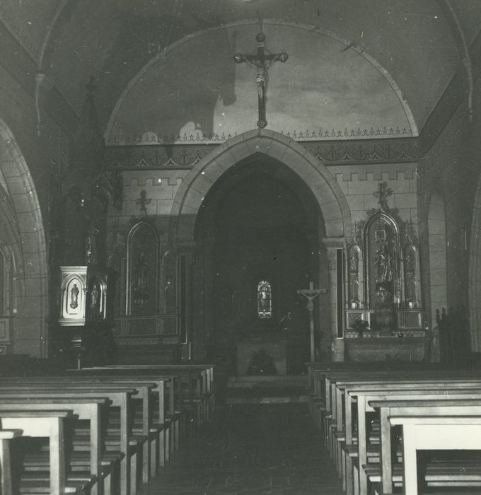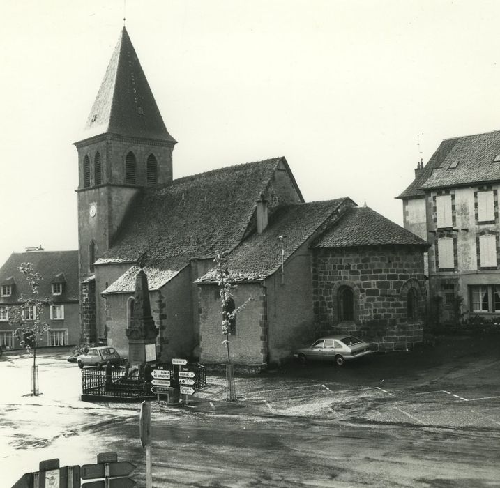 Cet édifice, modifié aux 15e, 17e, 18e et 19e siècles, a conservé de l'époque romane une travée de choeur, l'abside et le chevet. Le plan primitif du 12e siècle se composait d'une nef barlongue prolongée par un choeur carré et terminée par une abside semi-circulaire sur ses deux faces. L'arc triomphal et l'arc séparatif du choeur retombent sur des colonnes aux bases sculptées. Sur le chevet, les baies affectent l'aspect de fenêtres limousines avec colonnettes logées dans les piédroits et chapiteaux épannelés recevant un tore. L'église du 12e siècle a été édifiée sur un édifice antérieur. La nef du 12e siècle a été remplacée par une autre en plein cintre sans doute au 17e ou 18e siècle. En 1870, le clocher peigne, qui comportait quatre ouïes, fut remplacé par un clocher carré. Le chevet roman et les chapelles gothiques sont des éléments architecturaux caractéristiques des petits édifices ruraux de Haute Auvergne.