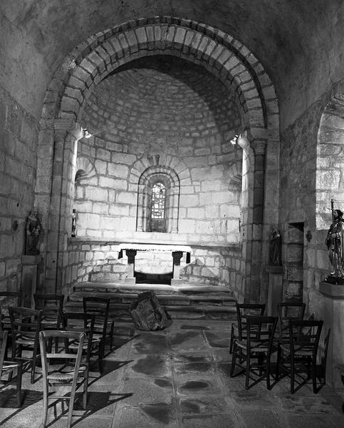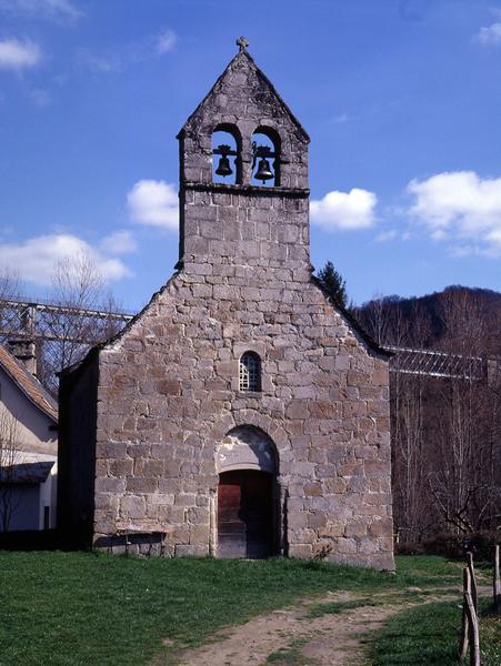 L'importance de l'agglomération et son éloignement du chef-lieu y firent élever un sanctuaire dès la plus haute Antiquité. L'édifice actuel remonterait au début de la période romane, comme en témoigne l'archaïsme des chapiteaux et des bases de colonnes et colonnettes. L'église est formée d'une nef rectangulaire et d'une abside semi-circulaire formant choeur. La nef est recouverte d'une fausse voûte en plâtre, mais dut porter autrefois un plafond ou une charpente apparente. Le choeur communique avec la nef par un arc en plein cintre à double rouleau, reçu par l'intermédiaire de larges tailloirs chanfreinés, sur des pilastres sans bases, le rouleau supérieur tombant en avant sur de petits pilastres cubiques engagés aux angles de la nef. Ces supports forment entre eux un angle où est adossée une colonne surmontée d'un chapiteau sans emploi dont la corbeille est ornée de demi-cercles accotés terminés par une boule, dont la forme est spéciale à l'arrondissement de Mauriac. Les chapiteaux de la fenêtre médiane éclairant l'abside, sont sculptés de deux lions affrontés pour l'un, et le même décor que ceux de l'entrée du choeur pour l'autre. La façade ouest s'ouvre par une porte dont l'arc en plein cintre encadre un tympan de 1778 et présente des chapiteaux ornés. Le clocher-mur se termine en pignon aigu, surmonté d'une croix antéfixe, et est percé de deux baies en plein cintre .
