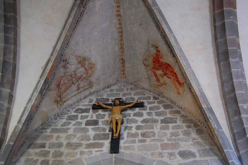 Eglise édifiée à la fin du 15e siècle. A cause du climat, portail et fenêtres s'ouvrent au midi. Sur le pignon occidental s'élève un clocher-peigne, ajouré de quatre arcades. Un escalier conduit à une galerie disposée en arrière des cloches, permettant les sonneries et l'entretien. L'édifice se compose d'une nef de quatre travées et d'un choeur à cinq pans. Deux chapelles n'ont pas été ajoutées, mais apparaissaient dans le projet primitif, formant une sorte de transept. Le tout est voûté d'arêtes nervées avec clefs sculptées. Un porche, également voûté, protège le portail méridional.