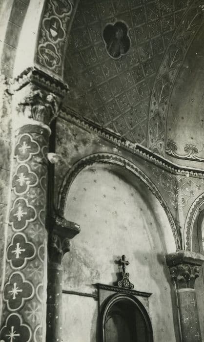 Eglise rurale ayant conservé un choeur d'époque romane. La nef a été remaniée postérieurement. Deux chapelles latérales formant faux transept lui ont été accolées au 16e siècle. La nef communique avec le choeur par un arc doubleau brisé reçu sur colonnes engagées sur dosserets, par l'intermédiaire de chapiteaux sculptés (feuillages, griffons). Le choeur, en forme d'abside à cinq pans coupés, est couvert d'un cul-de-four porté sur cinq arcatures en plein cintre dont les colonnettes sont surmontées par des chapiteaux aux corbeilles également sculptées de deux rangées alternées de feuilles lancéolées au-dessus desquelles s'enroulent des volutes.