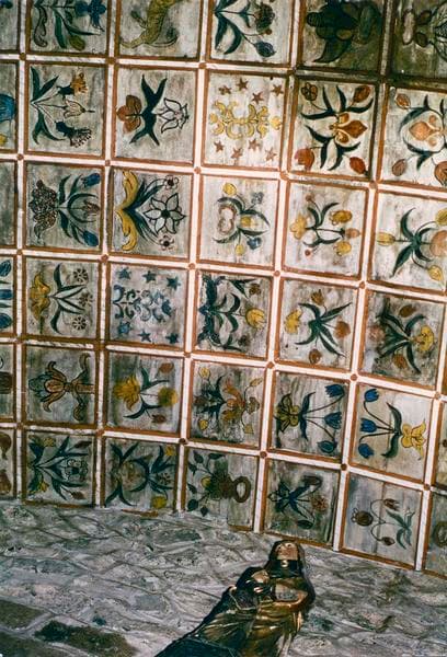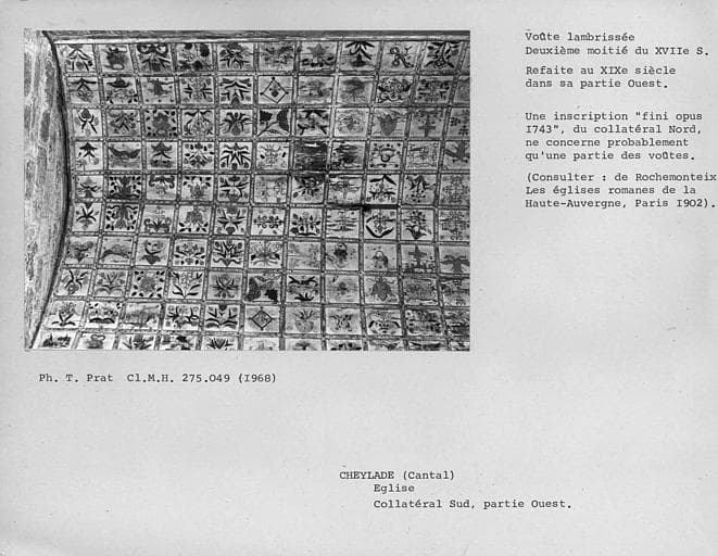 De l'église romane, qui comprenait une nef et deux collatéraux, ne subsiste que l'abside terminée par un mur droit, une travée de choeur et deux absidioles voûtées en cul-de-four. L'édifice fut ravagé une première fois par les Anglais ; les voûtes de la nef et des bas-côtés s'effondrèrent. Les travaux de réparation furent réalisés au 15e siècle, et construits les chapelles, le porche de deux travées qui supporte le clocher et le pignon occidental. Au 16e siècle, reprise des travaux avec élévation des quatre piliers circulaires avec l'intention de rétablir les voûtes en maçonnerie. Mais au cours des guerres de Religion, les toitures furent incendiées. Au 18e siècle, les nefs sont terminées en les couvrant d'une voûte en bois surbaissée. La voûte est divisée en caissons au moyen de moulures rapportées. La nef compte 560 caissons, et les collatéraux 400, tous décorés de peintures naïves représentant des fleurs, des animaux fantastiques, des angelots et les armoiries des familles du pays. Dans l'abside romane rectangulaire, voûtée en berceau, subsistent quatre colonnettes dont les chapiteaux ont un caractère très archaïque.
