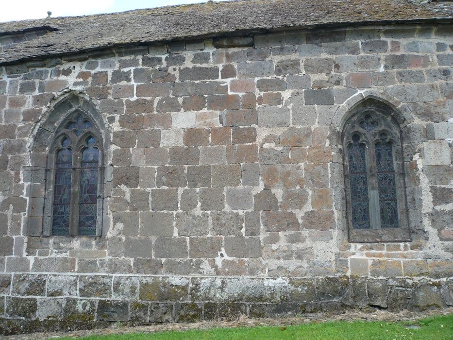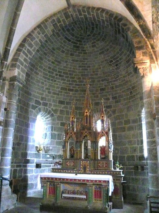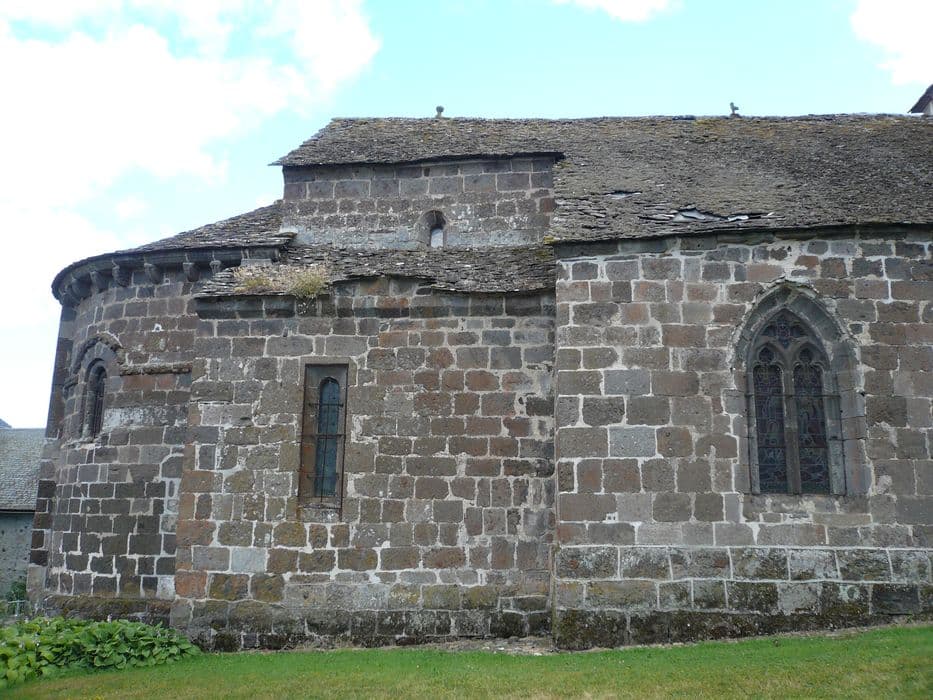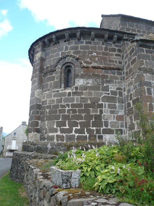 Le territoire faisait partie des domaines des seigneurs d'Apchon. C'est vraisemblablement sous l'impulsion et avec les subsides de ces seigneurs, qui prirent part aux premières croisades, que l'église fut construite. L'édifice servit de sépulture aux principaux membres de cette famille. La majeure partie de l'église remonte au 11e siècle, ce que confirment les sculptures du choeur (chapiteaux, corbeaux de la corniche). Les voûtes sur croisées d'ogives, avec liernes et tiercerons, durent être refaites au 15e siècle. Le plan en croix latine avec abside semi-circulaire fut également modifié au 15e siècle. L'abside en hémicycle est couverte en cul-de-four. L'arc légèrement brisé est soutenu par deux colonnes engagées d'époque romane. Trois travées forment la nef, avec deux chapelles de chaque côté, tandis que la première travée d'entrée correspond au porche. Toute cette partie est caractéristique de la fin du 15e siècle. Les voûtes avec liernes comportent des clés ornées de personnages sculptés. Le porche voûté en berceau abrite une porte formée de trois rangs de moulures du 15e siècle, surmontée de l'écusson des sires d'Apchon (semis de fleurs de lys). L'église contient une balustrade de tribune d'un travail de sculpture sur bois du 15e siècle. Peintures intérieures du 19e siècle.