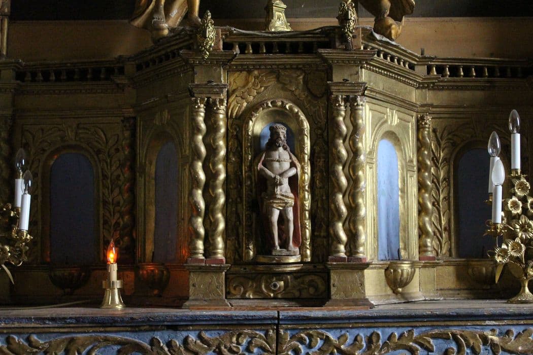 Edifice en tuf volcanique, formé d'une nef de trois travées flanquées de chapelles latérales, d'un porche et d'un choeur à chevet plat. Les deux premières travées de la nef, rectangulaires, séparées par un arc doubleau brisé, sont voûtées d'ogives, avec clefs de voûtes sculptées d'un quatrelobe. Les chapelles latérales sont également voûtées d'ogives. La troisième travée, plus profonde que les précédentes, présente des nervures retombant sur des culots à masques humains. Cette travée communique, par des arcs brisés, avec des chapelles voûtées d'ogives reçues sur des culots sculptés. De part et d'autre de l'entrée du choeur, un faisceau de trois colonnettes engagées surmontées d'un chapiteau sculpté de masques, reçoit les retombées de l'arc triomphal brisé, des ogives de la première travée de la nef et de celles du choeur. A l'extérieur, la façade occidentale est surmontée d'un clocher-mur barlong. Le portail est précédé d'un porche en berceau brisé. La non concordance de l'axe de ce porche, déporté vers l'ouest, avec celui du portail, indique la postériorité de sa construction. Le choeur est orné de peintures, avec les quatre Evangélistes figurés en médaillons aux compartiments de la voûte.
