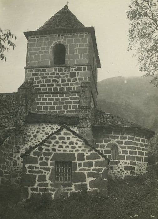 Eglise de la fin du 12e siècle, à laquelle furent ajoutées au 16e siècle les chapelles de la troisième travée de la nef. Le second étage du clocher et le petit porche sont de la même époque. L'édifice est entièrement voûté en berceau. L'abside a la particularité d'être à cinq pans intérieurement et à sept pans extérieurement. La corniche possède encore tous ses corbeaux sculptés de sujets profanes, volontairement détruits dans les autres édifices. Les pentures de la porte sont anciennes. Elles se terminent par des têtes de chiens et portent sur les plats des ornements gravés. Le clocher carré, ajouré sur ses quatre faces, repose directement sur le choeur. Ce monument est un bon exemple d'église rurale de la Haute Auvergne, d'aspect archaïque.