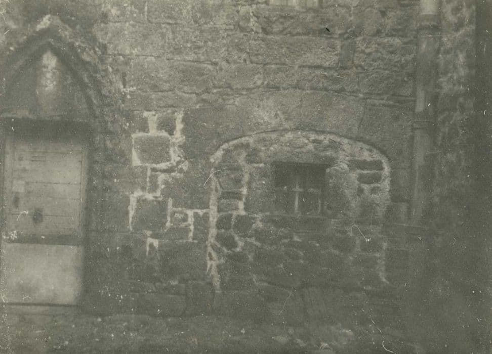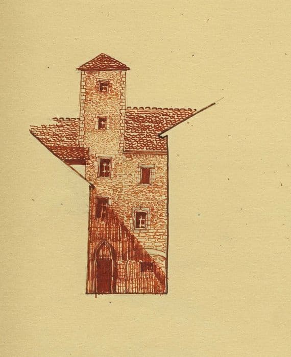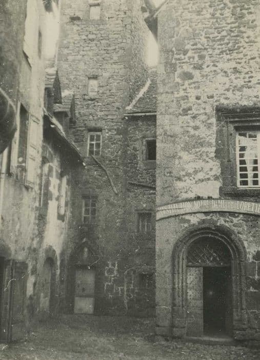 Maison avec tour d'escalier. La façade comprend, au rez-de-chaussée, une porte ogivale faite de deux boudins avec linteau droit qui devait porter, en son tympan, un motif décoratif maintenant disparu. Cette porte donne accès à l'escalier. A gauche se trouve une grande baie en anse de panier, avec linteau monolythe, qui a été bouchée. Le premier étage présente une fenêtre avec linteau sculpté en accolade ; le second, une fenêtre avec linteau et jambages moulurés. La tour est éclairée par quatre baies superposées. L'ensemble de la façade est faite en lave pour les encadrements de baies, et en petits éléments de schiste pour le reste.