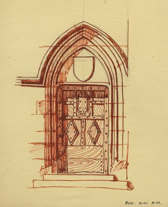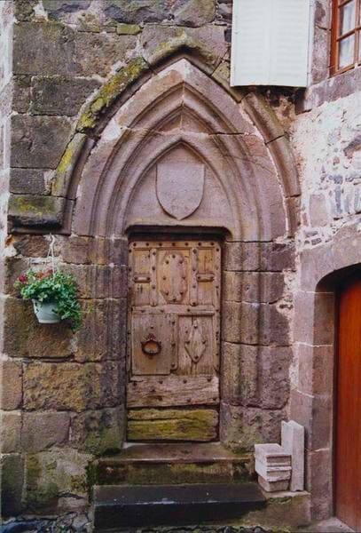 Immeuble formé d'un corps de logis rectangulaire accolé d'une tour d'escalier. La façade en retour de cette tour s'ouvre, au rez-de-chaussée, par une porte au seuil surélevé de deux marches, dont les piedroits et l'arc brisé inscrivant un tympan chargé d'un écu, sont moulurés de deux tores dégagés par des cavets et reçus sur bases prismatiques. A l'archivolte fait saillie un cordon en larmier formant, de part et d'autre, retour horizontal. La porte, aux angles supérieurs arrondis sous un linteau profilé d'un listel dégagé par deux cavets, est fermée par un vantail formé de panneaux assemblés en des cadres au moyen de clous en fer forgé. Dans le panneau central supérieur s'inscrit un octogone. Les deux panneaux sous ce dernier sont chargés, l'un d'un losange, l'autre d'une poignée en fer forgé formant heurtoir.
