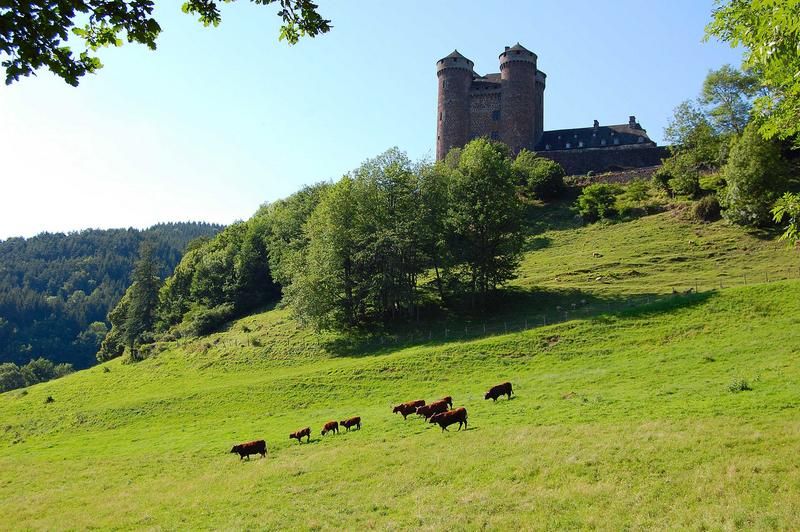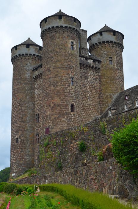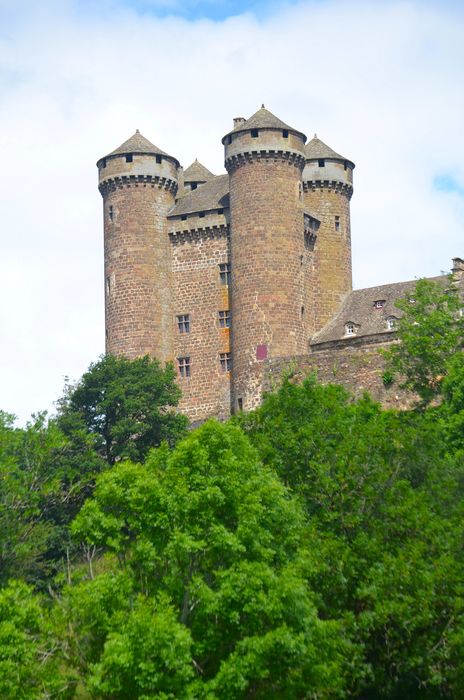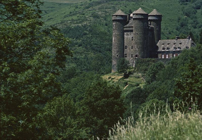 A côté du donjon médiéval renfermant de précieuses peintures murales des 15e-16e siècles, les Anjony firent bâtir au milieu du 18e siècle une aile indépendante plus adaptée aux exigences de confort et de décoration de l'époque : d'une architecture sévère, due à la rigueur du climat et à l'emploi de matériaux locaux, cette grise bâtisse rectangulaire en basalte ne comporte qu'un niveau principal surmonté d'importantes toitures de lauzes à deux niveaux de lucarnes. En revanche, l'intérieur renferme un ensemble de décors - boiseries, parquets, cheminées et trumeaux - réalisés avec toute la délicatesse et le raffinement du style Louis XV. Le long de l'allée d'accès au château, plusieurs bâtiments de communs, construits dans le même style, complètent cet ensemble exceptionnel.