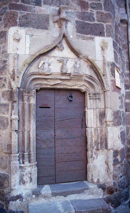Le rez-de-chaussée de la tour circulaire renfermant l'escalier à vis s'ouvrent par une porte avec, au-dessus, une fenêtre, unies entre elles par un décor d'accolades. Les piedroits sont ornés de moulures prismatiques d'où se dégage un tore chargé d'un filet reçu sur bases prismatiques. Le linteau est également mouluré d'un tore chargé d'un filet dont les extrémités s'épanouissent de part et d'autre en feuilles découpées et frisées. Au-dessus de ce linteau, un tympan sculpté en son milieu d'écu bûché que surmonte une Vierge couronnée en buste, portant l'Enfant, est inscrit sous une accolade aigüe moulurée. De part et d'autre de cet arc d'encadrement du tympan sont sculptés deux bouquets de feuilles à trois lobes et de grappes.