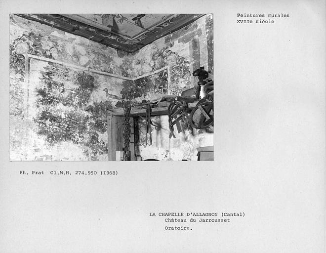 Le donjon primitif carré domine sur l'angle sud-ouest, les restes des constructions qui s'ordonnent autour d'une cour d'honneur située au sud. Ces bâtiments semblent correspondre à deux campagnes distinctes. Un corps de logis allongé (16e siècle) , adossé contre la face Est du donjon, flanqué par une tour ronde à l'angle nord-est, par une échauguette en encorbellement au sud-est, et par une tour d'escalier à l'angle sud-est. La deuxième campagne de travaux (17e siècle) englobe un bâtiment en L dont la petite barre s'élève dans le prolongement du logis précédent. L'aile en retour d'équerre s'allonge de façon à fermer le côté Est de la cour d'honneur. Le donjon présente un chemin de ronde couvert sur mâchicoulis ; sa face nord est percée de baies médiévales et sa face sud de baies repercées au 17e siècle. La tour d'escalier est percée d'une porte gothique dont le tympan est frappé aux armes de la famille Sauret. L'aile en retour d'équerre comporte des chambranles moulurés du 16e siècle (arcs en accolade) qui pourraient être des remplois. Dans la chapelle, le plafond lambrissé est peint. Divisé en cinq caissons aux bordures et frises dessinées, ce plafond comporte cinq scènes figurées : Dieu le Père au centre, et les quatre Evangélistes sur les angles. Sur les murs, scènes champêtres encadrées de motifs végétaux.