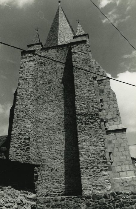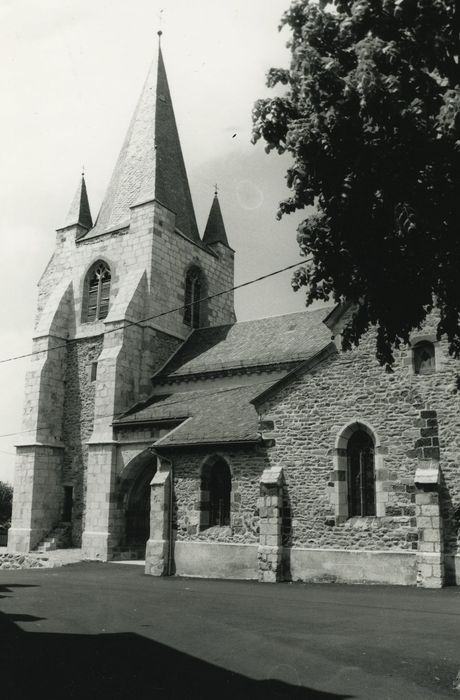 Vestiges romans de l'édifice primitif. Flèche reconstruite en 1854.