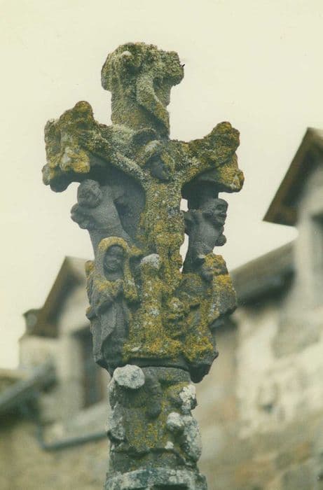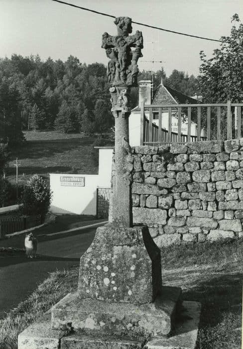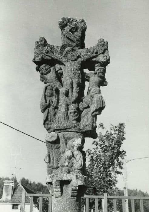 Croix du 15e siècle, érigée le long d'un itinéraire secondaire du pélerinage de Saint Jacques de Compostelle. L'ouvrage, en lave, se compose d'un emmarchement à deux gradins sur lequel est posé un bloc monolithe cubique, dont la partie supérieure est délardée en cavet renversé. Le fût de la croix et le croisillon sont sculptés dans deux blocs distincts. A mi-hauteur, le fût est orné d'une sculpture représentant le donateur agenouillé et accompagné d'un phylactère. Sur la hampe, saint Just, évêque de Lyon et patron de la paroisse, entouré de deux bergers, repose sur une corniche qui pourtourne la base de la hampe. La croix est à traverses courtes et fleuronnées. La face principale représente une crucifixion, avec le Christ et les deux larrons, la Vierge, saint Jean s'essuyant le visage avec son manteau et sainte Madeleine. Le revers représente la Vierge à l'enfant avec une Nativité : Vierge, saint Joseph, l'âne, le boeuf et le berceau en osier. Cette croix se distingue par son iconographie originale.