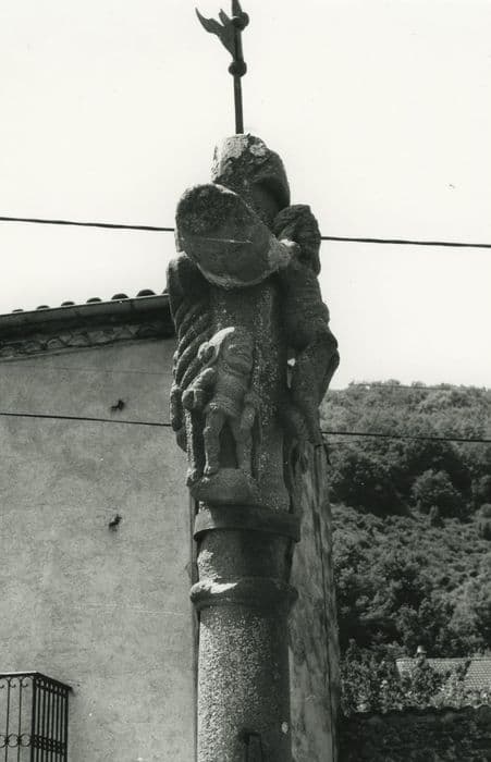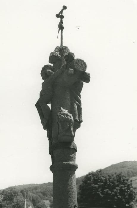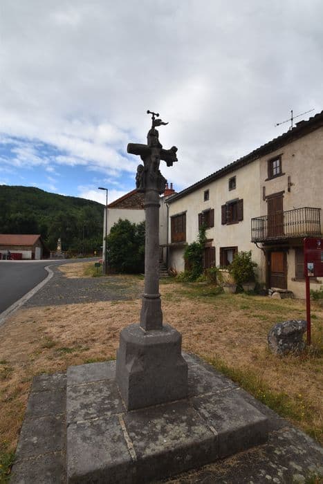 Croix du 15e siècle qui aurait été donnée par les Templiers installés au hameau de Tempel, dépendance de la commanderie de Celles. Edifiée en basalte, cette croix de 1, 90 mètre se compose d'une base formant un double emmarchement ; d'un socle carré amorti en facettes prismatiques et baguées, monolithe avec le fût cylindrique ; d'une croix aux extrémités fleuronnées et ornée de personnages (Christ en croix sur la face Est ; personnage féminin sur la face ouest). Une girouette surmonte cette croix.