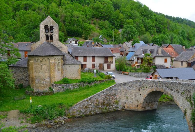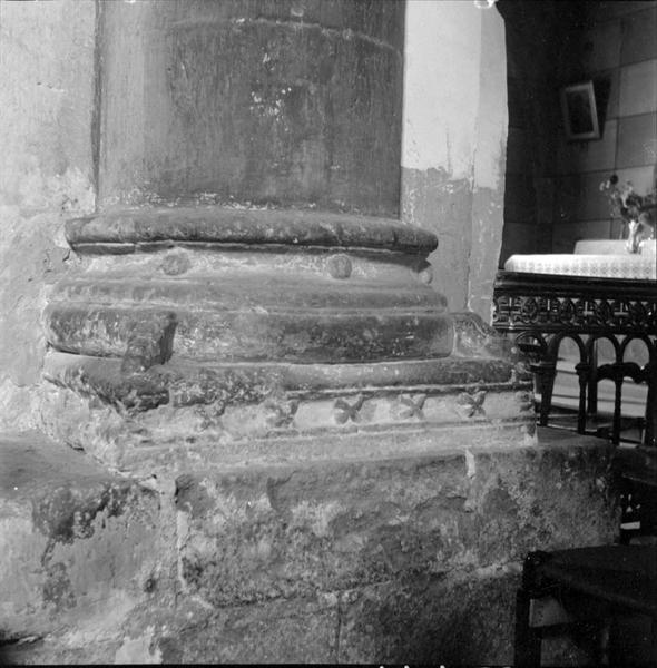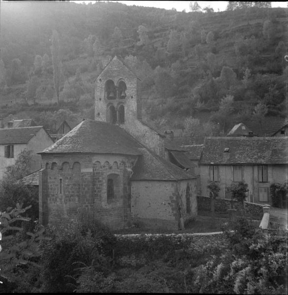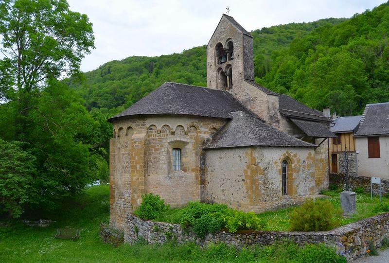 L'église du 12e siècle comporte une abside circulaire avec travée de choeur voûtée en berceau. La nef, actuellement voûtée en plâtre, était autrefois recouverte d'une charpente. Deux chapelles formant transept ont été ajoutées au 18e siècle. Extérieurement, l'abside porte une corniche à modillons au-dessus d'arcatures sur corbelets sculptés. A l'intérieur, deux portes colonnes engagées supportent le clocher à arcades géminées. Peintures murales ornant le choeur.