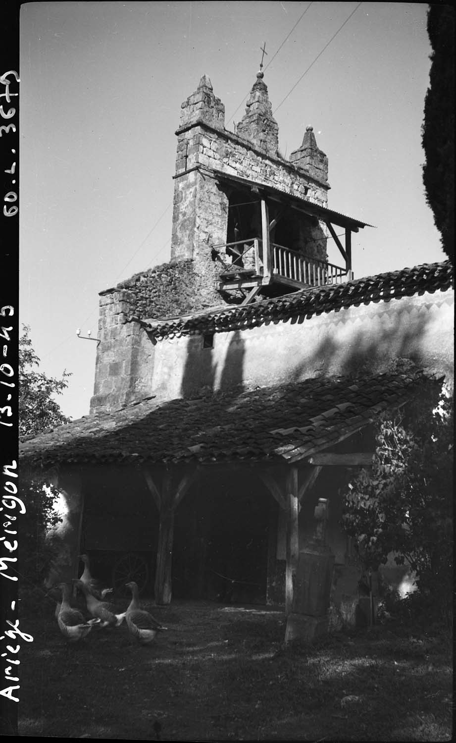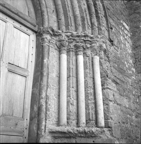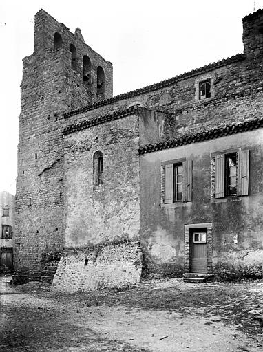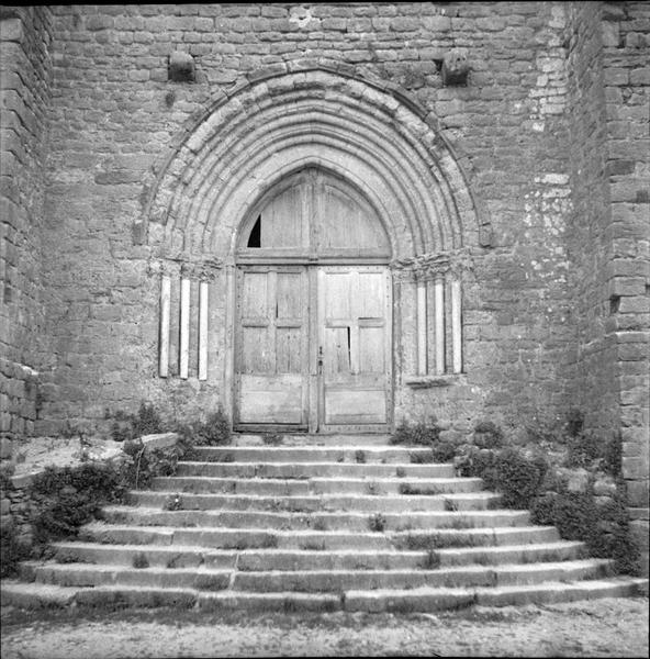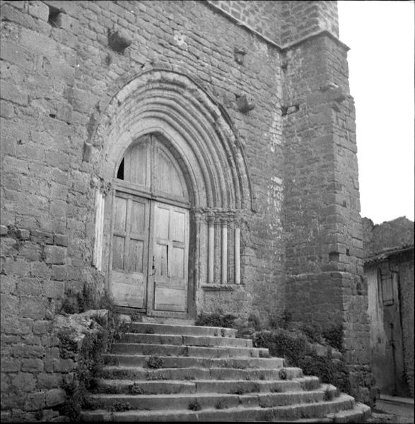 Edifice du 12e siècle à abside rectangulaire de deux travées voûtées d'un berceau brisé. Au sud de la nef est accolée une chapelle carrée du 15e siècle. La façade ouest dans laquelle s'ouvre le portail, est couronnée par un campanile qui ne conserve plus qu'un rang de quatre baies plein cintre avec des cloches. Il existait sans doute un second rang qui s'est écroulé et a été arasé. La façade est épaulée par deux épais contreforts. Un double rang de corbeaux au-dessus du portail indique l'existence d'un porche en charpente. Le portail comprend quatre archivoltes à boudin torique dont trois sont portés par des colonnes reposant sur un socle. Ce portail paraît avoir été rajouté au début du 14e siècle. L'édifice était fortifié. Un escalier ménagé dans l'angle sud de la façade permettait l'accès au chemin de ronde.