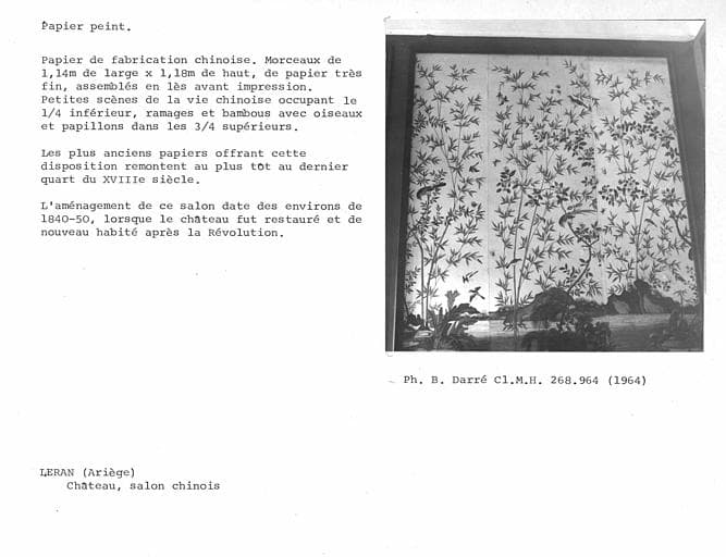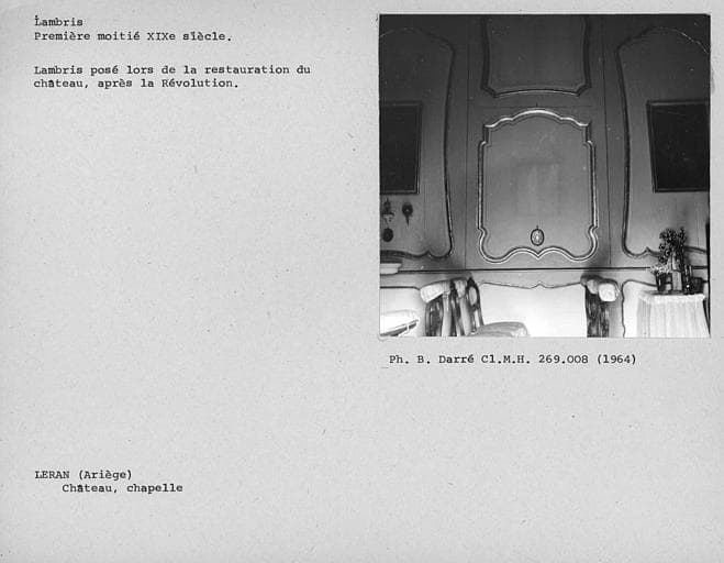 Léran fut, à l'origine, une forteresse bâtie au 13e siècle, composée de trois tours épousant les irrégularités du sol. Ce fut un poste de défense placé à proximité du château de Montségur, dernier réduit de l'armée albigeoise. Son histoire est liée aux luttes de la croisade des Albigeois, dont le seigneur de Levis fut l'un des vainqueurs. Il devint la résidence d'une branche cadette de cette famille et ne participa plus qu'à des conflits locaux. De l'ancien château, les maçonneries existent encore, en grande partie englobées et refondues dans des constructions postérieures s'étendant du 15e au 19e siècle. Les fantaisies médiévales ajoutées au 19e siècle étouffent l'authenticité de la construction. Un escalier du 17e et une tour du 14e subsistent à l'intérieur du château. Les aménagements intérieurs du 19e siècle ont détruit la plupart des aménagements antérieurs. Les murs de la chapelle ont été revêtus de boiseries Louis XV, de style italianisant, provenant du château de Lagarde, tombé en ruines à la Révolution.