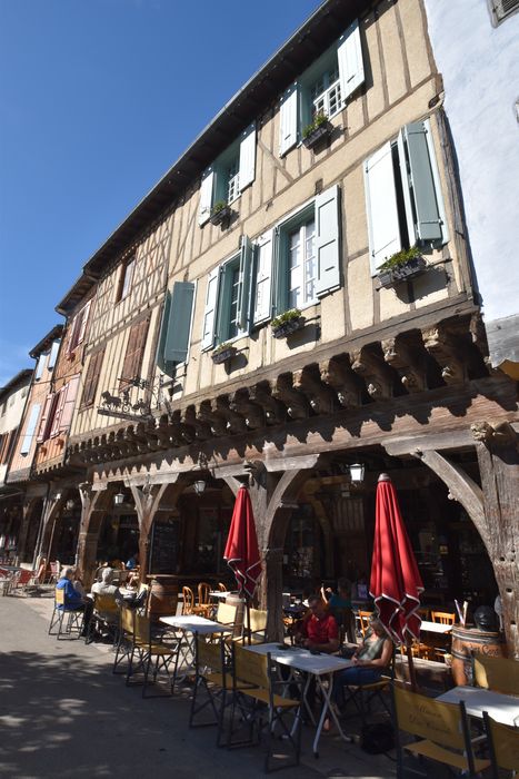 Sur la place encadrée de couverts, cette maison se distingue par la richesse de son ornementation. Les solives sont apparentes et leurs abouts en encorbellement sont sculptés de têtes humaines. Elles sont soulagées, dans leur portée, par un double rang de corbelets également ornés de figures ou d'animaux.