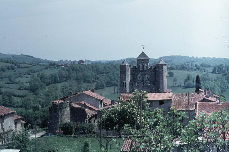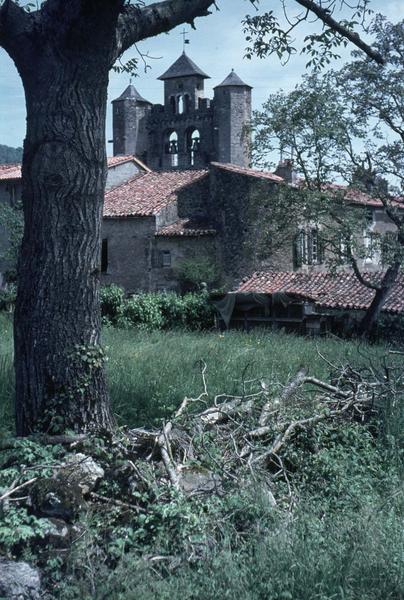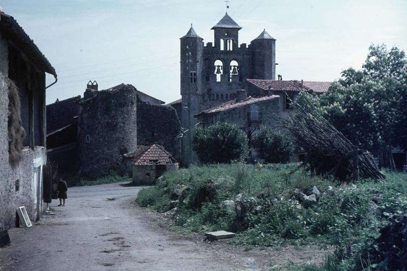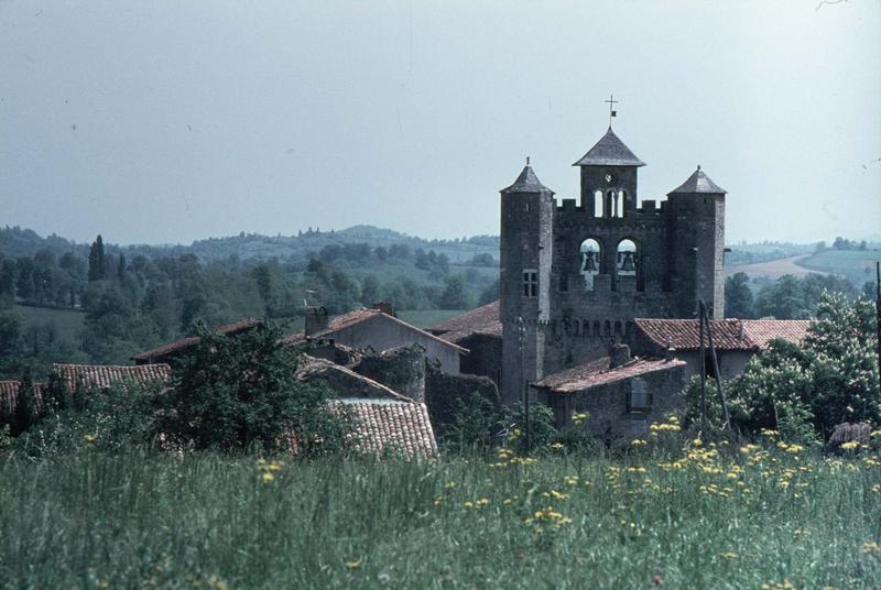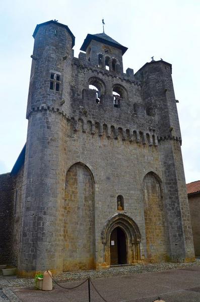 La façade présente tous les caractères de la fin du 12e siècle. Le campanile ne saurait remonter au-delà du 14e siècle, ainsi que l'archivolte de la porte d'entrée qui a été remaniée. Les deux tourelles ont été exhaussées probablement au 16e siècle ; leur ancien crénelage, englobé dans la maçonnerie, reste visible partout. Cette façade a été conçue comme un point fortifié, comme en témoigne aussi l'accès aux deux galeries crénelées, desservies par un escalier placé dans la tourelle de droite, et dont le départ se situe à quatre mètres du sol. Cet escalier se terminait par un escalier plus étroit conduisant au crénelage de la tourelle. Les deux étages de la tourelle de gauche n'étaient desservis que par les galeries.