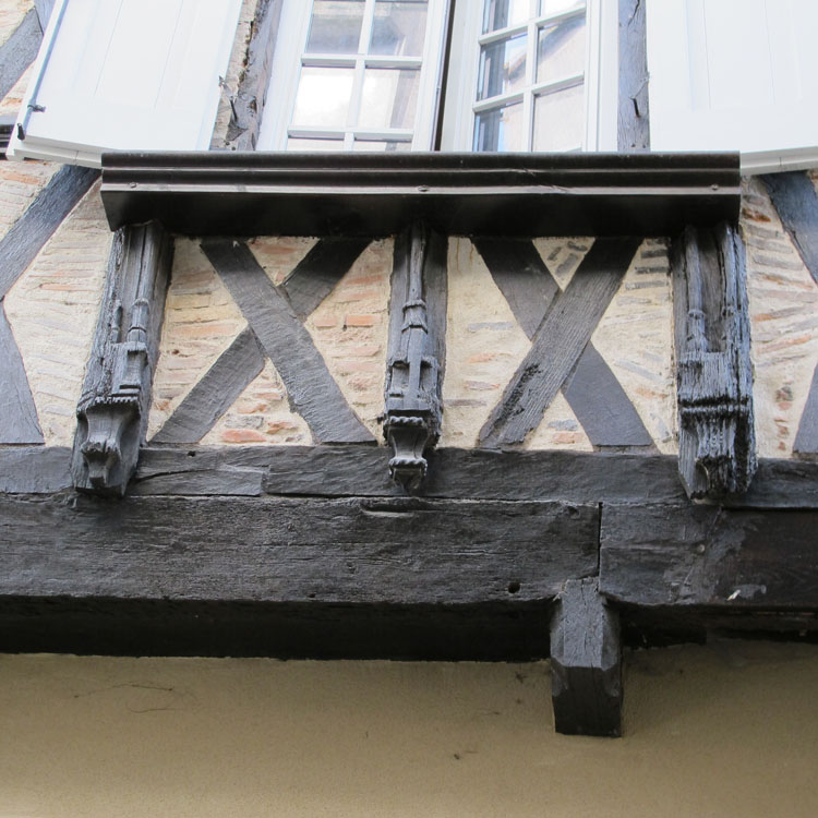 Le pan de bois est divisé en poteaux et traverses formant de petits rectangles avec croix de Saint-André, suivant l'usage dans la région. Poteaux et traverses moulurés. Amortissements des poteaux profilés sur la sablière basse. Remplissage en brique.