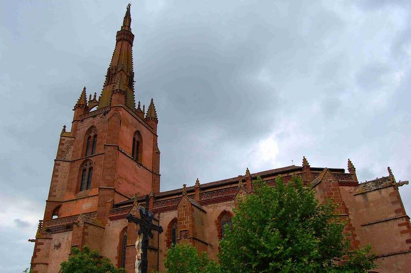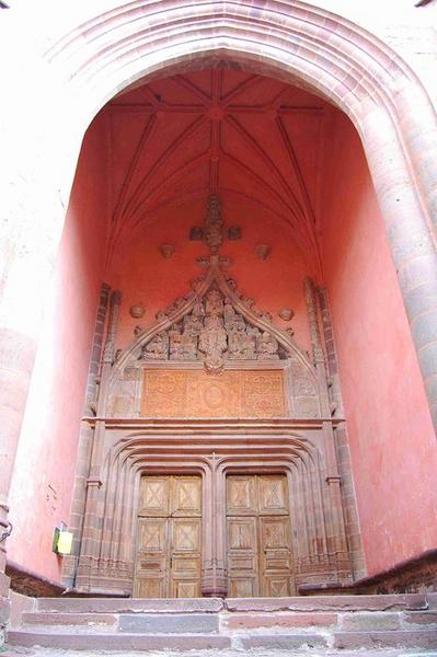 Ancienne église abbatiale, entièrement reconstruite vers 1520. La disposition des chapelles autour du chevet est assez particulière. La nef ne comprend que deux travées et semble n'être que l'accessoire du clocher. Le clocher forme la façade occidentale, et est bâti en grès rouge local. Il se compose d'une tour carrée et d'une flèche octogonale. A la base de la flèche se trouvent quatre clochetons octogonaux réunis à la flèche par des arcs-boutants. Le bas de la tour sert de porche à l'église. L'arc en accolade de la porte forme tympan et représente l'Assomption de la Vierge. Au-dessus du porche, la tour comprend une vaste salle dite "salle des chanoines" car le chapître y tenait ses réunions. Au-dessus encore, le beffroi s'ouvre par de grandes baies à meneaux sur ses quatre faces. L'église est entourée par onze chapelles, dont trois à l'abside et quatre de chaque côté. L'église est éclairée par dix-huit fenêtres géminées, à meneaux, surmontées de trèfles, de flammes, de quatrefeuilles.
