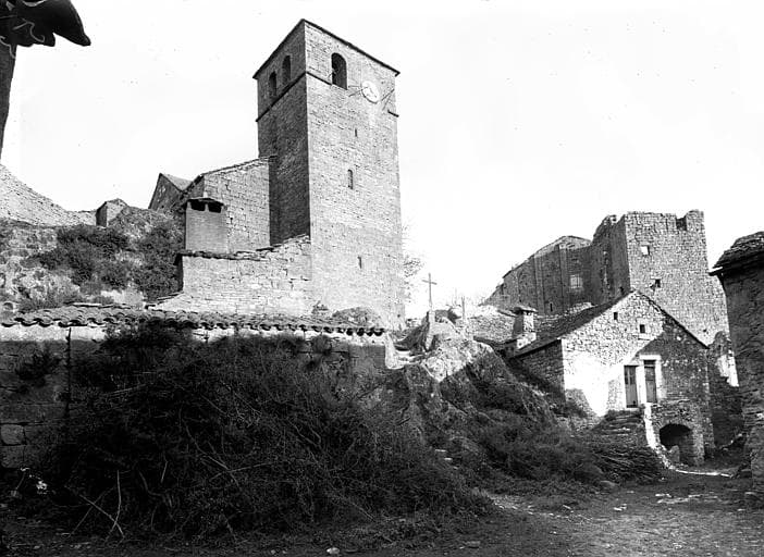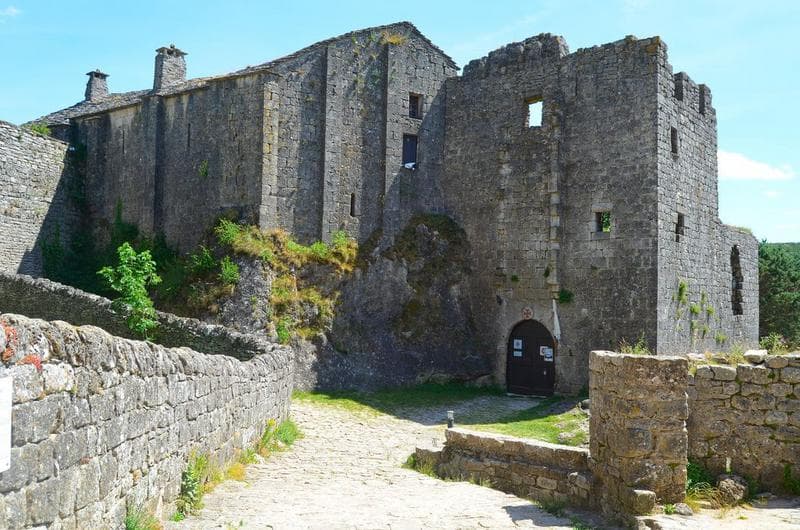 La Couvertoirade fut une place forte dont la fondation remonte aux Templiers qui, en 1158, avaient été mis en possession du Larzac par Raymond Bérenger, comte de Barcelone et roi d'Aragon. En 1182, la donation au Temple fut confirmée. Après dissolution de l'ordre du Temple, plusieurs biens passèrent aux Hospitaliers en 1312. En 1562, la place résiste à un assaut des Protestants. En 1566, elle est prise par le capitaine huguenot Sausset, et reprise peu après par l'évêque Claude Briconnet de Lodève. L'accès au château se fait par une rampe protégée par une barbacane. L'entrée se fait par une porte en arc brisé surmonté d'un assomoir. A gauche de la porte se dresse le donjon du 12e siècle garni de contreforts. Auprès de la porte, la muraille est percée de baies du 15e siècle. Contre le donjon, un escalier taillé dans le roc donne accès aux divers étages. La partie basse se compose d'une longue salle voûtée en berceau et éclairée par deux meurtrières. Les salles supérieures sont voûtées en plein cintre et éclairées par des baies à redents. Sur l'avant-dernière terrasse s'ouvrent deux salles voûtées. Dans l'une d'elles se remarque l'orifice de la citerne d'eau. A l'extrémité sud, la terrasse supérieure s'appuie sur un rocher autrefois surmonté de défenses. Sous cette partie reprend le mur d'enceinte. Au sud-ouest, deux courtines renforcées de tours, permettent d'arriver à la grosse tour ronde du nord-ouest.