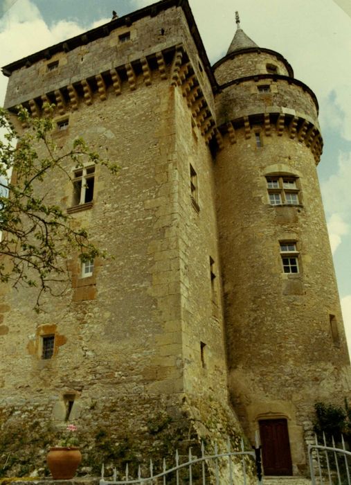 Le château, restauré vers le 14e ou le 15e siècle, a appartenu dès le 11e siècle à l'abbaye de Conques pour passer ensuite sous la dépendance de l'abbaye de Loc-Dieu. L'édifice comprend un logis rectangulaire flanqué d'une tour servant d'escalier. Un chemin de ronde avec mâchicoulis et créneaux ceinture l'édifice.
