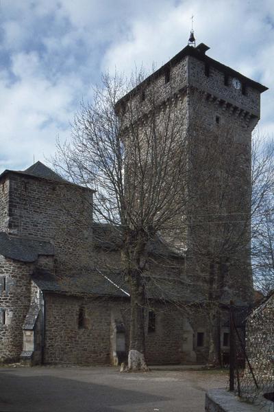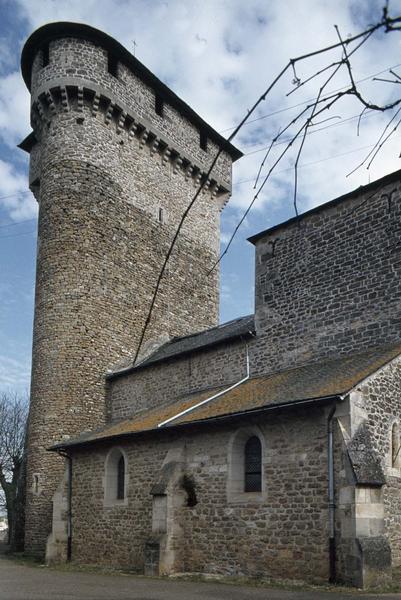 L'église appartient à deux époques. La nef unique a été agrandie de deux bas-côtés à la fin du 15e siècle. Le clocher-donjon a été conçu, de la base au sommet, pour servir de défense et de refuge à la population. Ce clocher comportait cinq étages habitables, séparés par des planchers. Le sixième étage servait à la défense, avec mâchicoulis en enborbellement sur les quatre faces et au pourtour de l'escalier à vis. La première travée de l'église, formant abside, constitue le rez-de-chaussée du clocher.
