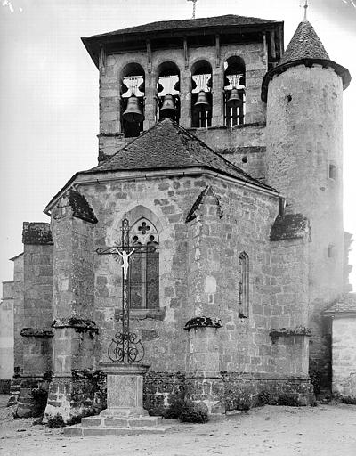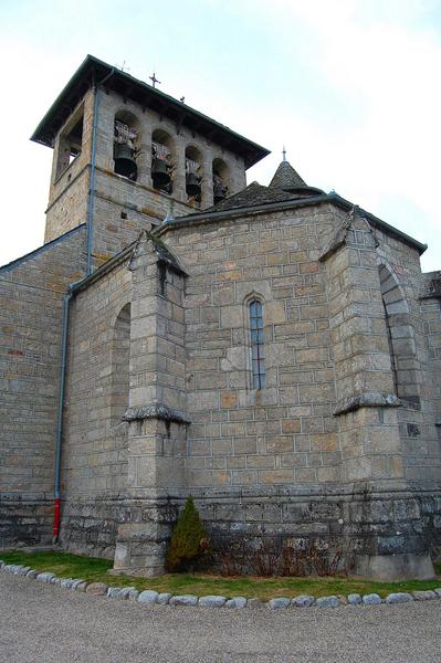 Eglise comprenant une nef de trois travées accompagnée de bas-côtés et terminée par un choeur polygonal avec abside à trois pans. Le porche voûté élevé au centre de la façade sud, est cantonné de jambages formant tourelles crénelées où apparaissent des têtes de personnages. Un clocher à quatre arcades abrité par un auvent en charpente s'élève sur l'arc triomphal. Il est desservi par un escalier à vis. Clocher et escalier pourraient être du 16e siècle. Les sommets des contreforts reproduisent une tourelle de château à deux étages de mâchicoulis. De fausses arcatures avec claire-voie décorent le parement et, aux créneaux, apparaissent de petits personnages casqués. Au-dessus du chemin de ronde, une dernière tourelle forme le sommet du fuseau.