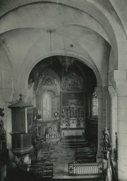 L'église se compose d'une nef, un transept et un choeur polygonal. La nef, primitivement voûtée, a été couverte d'un plafond au 19e siècle. Au bas de la nef existe une vaste tribune du 15e siècle reposant sur des voûtes de cette époque. Le transept du 12e siècle repose sur quatre arcades plein-cintre qui supportent une voûte refaite au 16e siècle. Le choeur pentagonal est couvert d'une voûte de bois avec pendentif, datée de 1562. Chapiteaux romans.