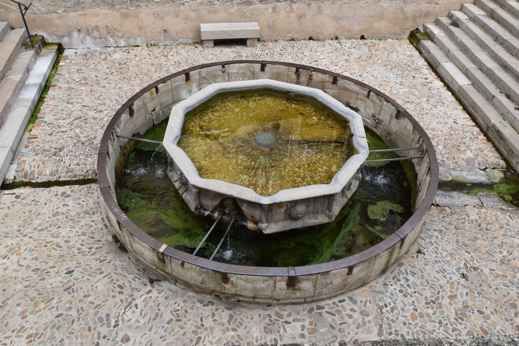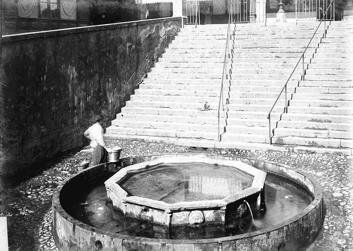 Cette fontaine occupe un terrain enclos de murs. L'accès se fait par douze marches qui occupent tout un côté du rectangle. L'eau est reçue dans deux vasques. La margelle du premier bassin est circulaire, décorée sur le pourtour de corbelets en méplat. La vasque du milieu est à dix pans ; à chaque angle, une colonnette cantonne la margelle et porte la moulure haute. Les faces portent quatre goulottes et six têtes ou mascarons en relief.
