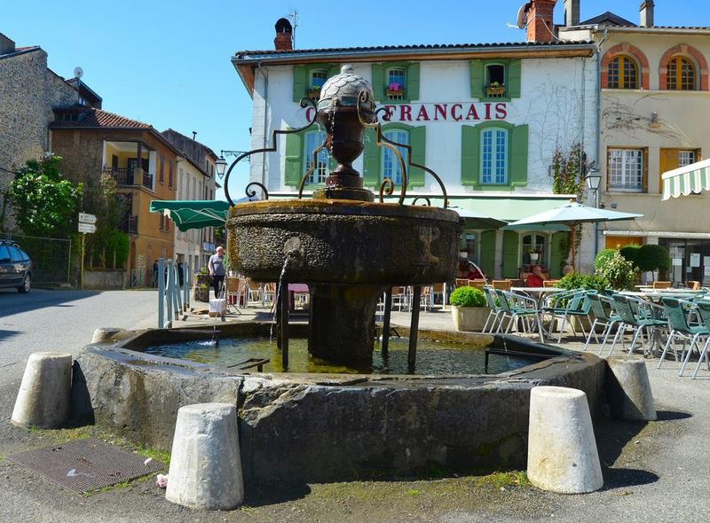 Cette fontaine aurait été offerte à la ville par Catherine de Coarraze, fin 15e début 16e siècle, mais son architecture semble plus tardive. La fontaine comporte un bassin inférieur à pans coupé, octogonal ; un bassin supérieur, plus petit, circulaire, posé sur un pilier central en pierre. De ce deuxième bassin émerge un ornement en pot-à-feu qui pourrait dater du 17e siècle. Surmonté d'une cloche ornée d'ardoises en écaille, cet ornement est relié au bassin circulaire par quatre volutes en fer forgé entre lesquelles jaillissent de fins jets d'eau.