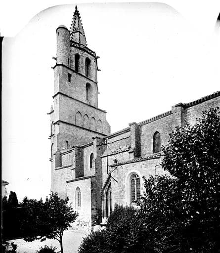 Clocher en pierre bâti sur plan carré à la base. Le rez-de-chaussée est voûté sur croisée d'ogives et forme porche. Au-dessus, deux étages ornés extérieurement d'arcades aveugles. Les bases de ces arcades reposent sur des bandeaux indiquant la séparation entre les étages. Des colonnes amortissent les angles au-dessus du deuxième étage. La construction du plan carré passe à l'octogone. Les troisième et quatrième étages, octogonaux, sont percés de baies plein cintre. A l'angle sud-est, se trouve la tourelle contenant l'escalier en spiral, octogone de la base à l'avant-dernier étage.