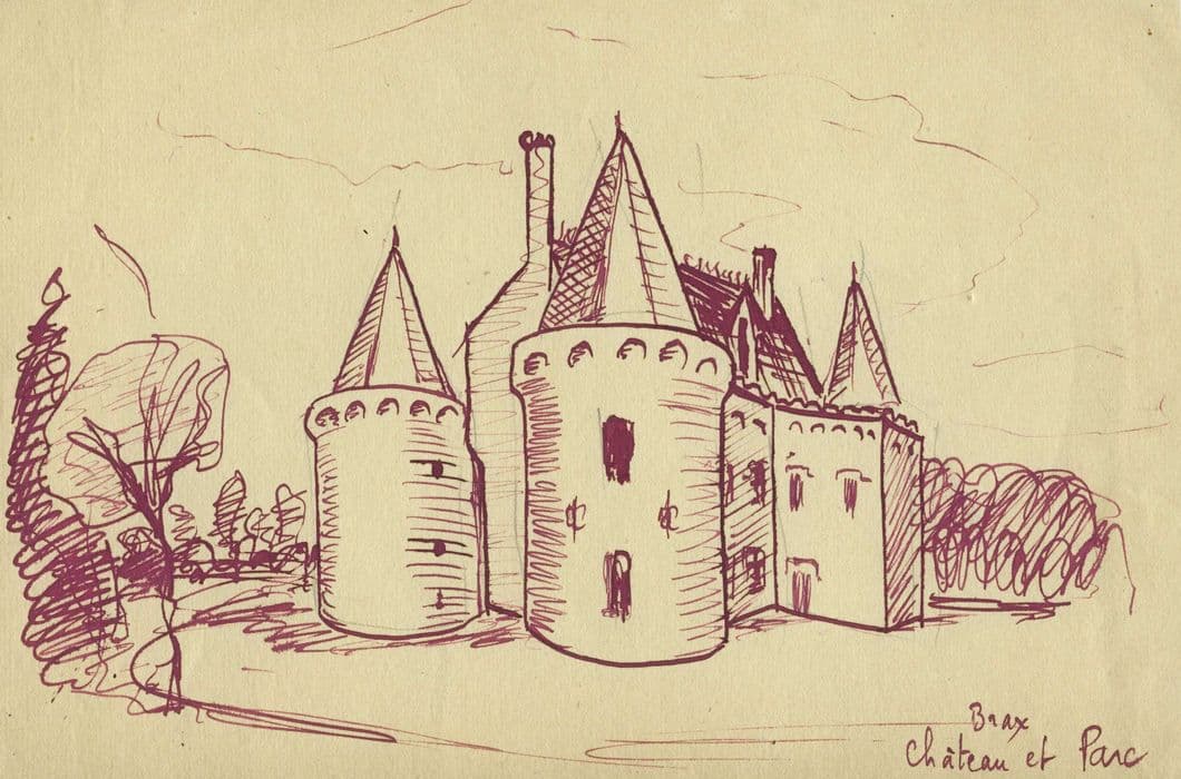 Edifice cantonné de quatre tours circulaires. A la façade postérieure est accolé le bâtiment contenant le grand escalier. C'est une construction en briques dont les murs sont couronnés de créneaux. La façade principale se développe sur le parc, et l'accès se fait par un perron à double rampe. Un chemin de ronde, porté par de faux mâchicoulis formés d'encorbellement de briques et petites arcatures, ceinture l'ensemble de la construction.
