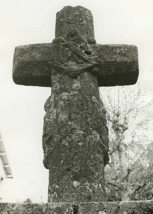 La croix est plus ancienne que le socle qui date du 17e ou 18e siècle. La croix a une section octogonale irrégulière et porte des motifs sculptés. Sur les faces, antérieure et postérieure, chaque coin du carré, délimité par l'intersection des deux branches de la croix, s'orne d'une boule. Sur la face antérieure, un Christ crucifié est encadré par les symboles des Evangélistes tenant chacun un phylactère. Sur la face postérieure, une Pietà est posée sur un culot qui semble être une tête d'ange entre ses ailes. Les faces latérales de la branche inférieure de la croix portent chacune un évêque, les pieds posés sur un motif rappelant la tête d'ange. Ce calvaire faisait l'objet de processions.