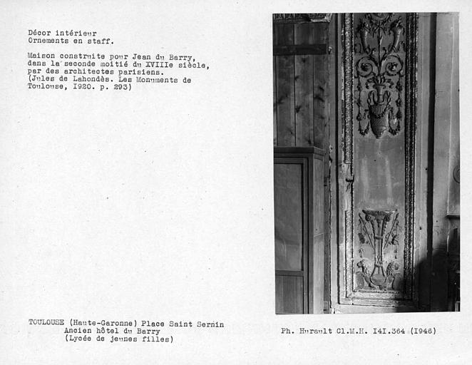En 1774, après la mort de Louis XV, Jean du Barry est disgracié et exilé à Paris. Puis, il obtient son pardon et rentre à Toulouse où, en 1776, il achète immeubles et terrains donnant sur la place Saint-Raymond. En 1777, il entreprend la construction de l'hôtel auquel il veut donner un lustre comparable à celui de Versailles. En 1794, après la mort du propriétaire, le mobilier est vendu comme bien national et l'hôtel loué. En 1817, les Bénédictins s'y installent et transforment l'édifice. En 1905, il est rattaché au lycée de jeunes filles. Durant la Première guerre mondiale, un hôpital militaire y est installé. L'ensemble présente trois constructions différentes. A droite, l'hôtel présente sept fenêtres sur une façade décorée. Au centre, la "maison du Barry", ancien immeuble du 17e siècle raccroché à l'hôtel. Enfin, à gauche, une dernière travée construite par Du Barry avec, au premier étage, une grande fenêtre vénitienne. A l'intérieur, les pièces présentent un décor utilisant stuc, peinture, dorure et ferronnerie.