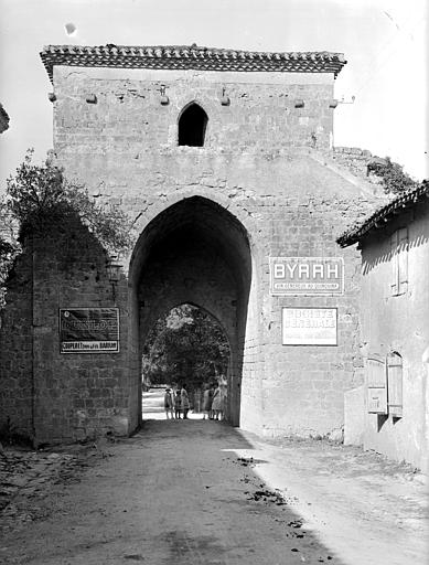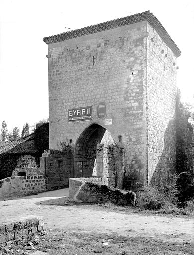Ancienne tour barlongue qui franchit la rue principale et livre passage par une baie en tiers point. Elle se compose de deux murs parallèles soutenant une voûte en berceau brisé. Au-dessus de cette voûte se trouve une petite salle où se tenaient les défenseurs, le corps de garde. A la partie haute, se devinent les traces d'anciens mâchicoulis. Les murs d'enceinte ont disparu mais le pont précédant la tour subsiste, enjambant ce qui était le fossé.