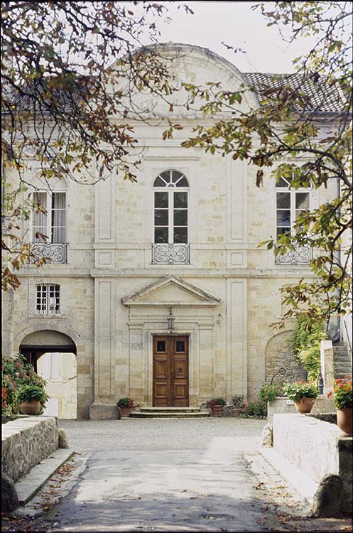 Le château a été construit par l'abbé de Condom, Montassieu de Galard, au 13e siècle. En 1567, Blaise de Monluc y apporte de nombreuses améliorations. Au début du 18e siècle, Monseigneur de Milon opère d'importantes modifications dans le goût classique. L'édifice est disposé sur deux ailes perpendiculaires formant une cour bordée, sur son troisième côté, par l'église. L'accès de fait par un pont enjambant le fossé. La partie la plus ancienne est l'aile nord qui conserve les murs de l'ancien château médiéval. L'aile nord se compose, au rez-de-chaussée, de petites salles desservies par un couloir, aboutissant aux cuisines recouvertes d'une coupole de briques posées de champ. Un escalier à vis, sur le côté, mène à la terrasse supérieure aménagée au 19e siècle. La travée axiale de la façade d'entrée est surmontée d'un fronton curviligne. Deux pilastres plats cantonnent la porte d'entrée, décorée d'un fronton triangulaire. Deux baies en anse de panier flanquent la porte d'entrée. A l'ouest, la façade est flanquée de deux tours. Une galerie munie d'un balcon en fer court le long de cette façade, ainsi que la façade méridionale où s'ouvre le chai. A l'intérieur, une vaste cage d'escalier dessert le château. Au sud du château, dans le prolongement de l'église, trois arcades en anse de panier servent de porche à des communs.