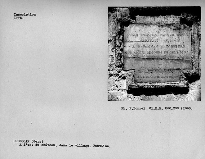 Fontaine offerte au village par le chevalier de Bourg. Deux pilastres encadrent une partie centrale où se trouve l'inscription de donation, dans une moulure en boudin. Un entablement surmonte l'ensemble. Un bassin semi hexagonal se trouve devant.
