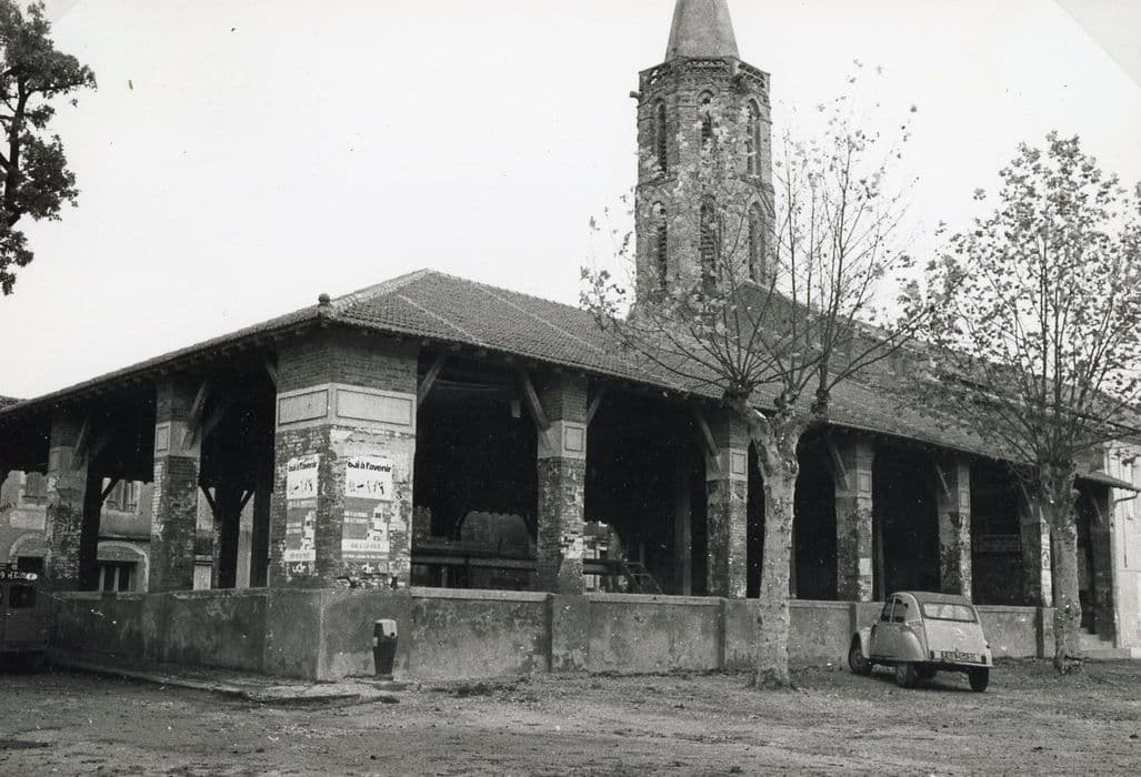 Selon la tradition locale, la halle daterait du 16e siècle, mais elle est caractéristique d'une ville neuve du Moyen-Age. Elle présente le jumelage entre la halle et la place à cornières, parti destiné à favoriser les transactions commerciales. La halle fait également fonction d'emban par rapport à l'église. Deux piliers sont adossés à l'église. Ceux du pourtour sont en brique. Primitivement, ces piliers étaient en bois. A l'intérieur, les poteaux de bois comportent des chapiteaux sculptés. L'allée centrale monte plus haut que les allées latérales.