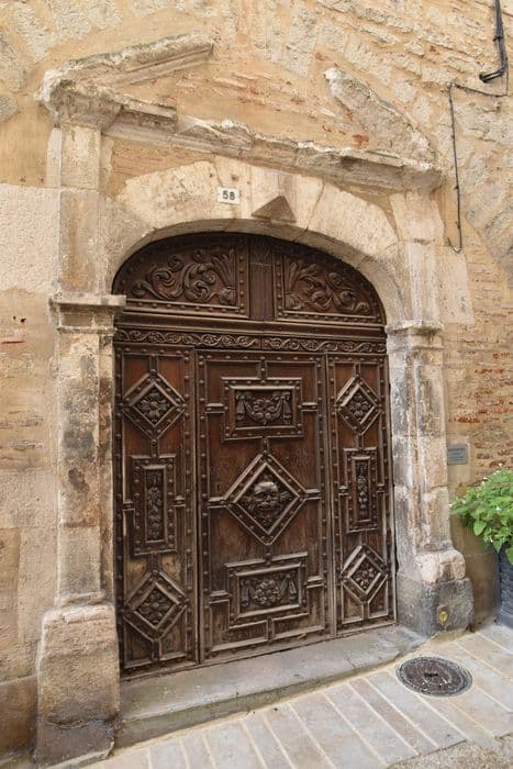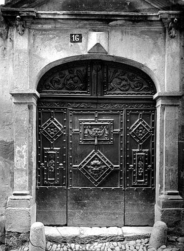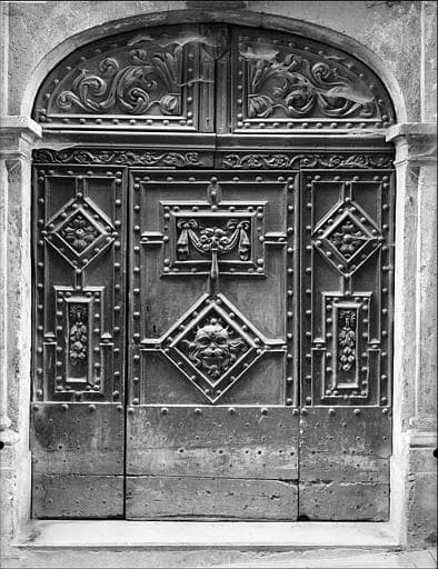 Porte ouvrant en trois parties, avec imposte. Fond constitué par de larges plateaux de noyer, sur lesquels sont fixés, au moyen de gros clous à tête ronde, des moulures qui dessinent des panneaux carrés et rectangulaires. A l'intérieur de ces panneaux, motifs de sculpture. Les panneaux d'imposte et la traverse sont décorés de rinceaux sculptés.