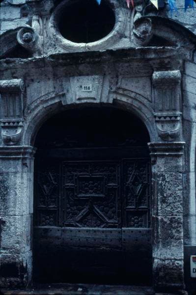 Cette porte est un beau specimen de menuiserie régionale du 17e siècle. Les panneaux, tous sculptés, sont encadrés de moulures fixées sur le fond, au moyen de gros clous à tête ronde. Un marteau en fer est fixé au-dessus du panneau central. Au centre du motif sculpté de l'imposte, on remarque un écusson armorié d'une tête de lion.