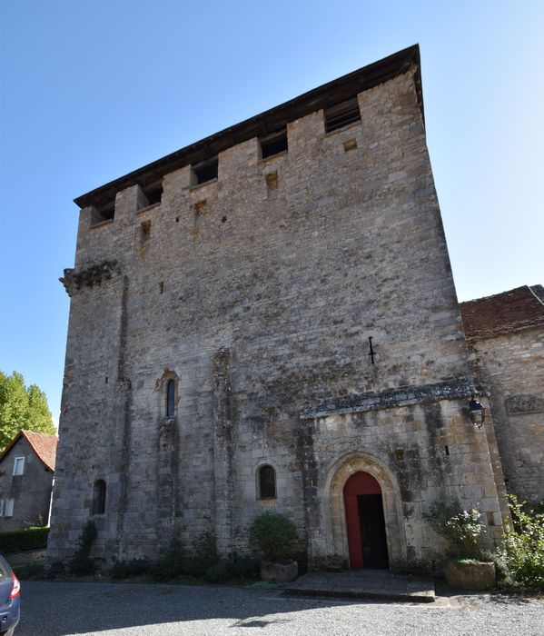 Cet édifice pourrait être le résultat de la réunion d'une église à une forteresse. Les murs extérieurs, de plan presque carré, sont surmontés de créneaux qui devaient autrefois se retrouver sur les quatre faces. Les arcs de la nef présentent un commencement d'ogive. Les parois du choeur présentent une sorte de triforium, avec colonnettes ornées de personnages. L'église fut donnée en 889 au monastère de Figeac par l'évêque de Rodez.