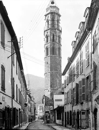Cette tour est tout ce qui reste de l'ancienne église de ce nom et du couvent des Dominicains qui auraient été bâtis vers 1373. A l'origine, cette tour formant clocher ne possédait que deux étages de fenêtres. Elle était coiffée d'une flèche en ardoises. Au premier étage, les baies sont encadrées d'une mouluration de caractère 15e siècle. Ces baies sont fermées par des arcs plein cintre surmontés d'une accolade terminée par des fleurons et reposant sur des corbeaux. Cette tour fut en partie détruite par la foudre et reconstruite au 16e siècle. La tour est construite en pierre appareillée irrégulièrement. Il ne reste presque rien de l'escalier primitif en pierre. Quelques marches seulement subsistent au départ ainsi que l'encadrement en pierre de la porte. La partie supérieure de la tour a été remaniée sous la Restauration qui a mis au goût du jour les deux étages supérieurs.