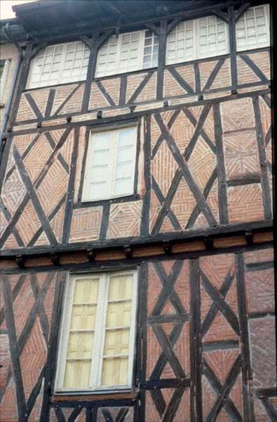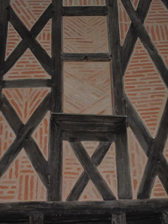 Façade à pans de bois disposés en losanges traversés par des croix de saint André. Cette disposition produit de petits losanges dans les grands. Au premier étage, cette disposition n'apparaît qu'à droite et à gauche, les autres panneaux sont en croix de saint André. Au troisième étage, la toiture est supportée par des piédroits renforcés par des bras. Chaque étage est en encorbellement. La carcasse en bois est garnie de briques peintes. Celles-ci forment une sorte de mosaïque. Le linteau de la porte est orné d'un écusson portant une inscription latine.