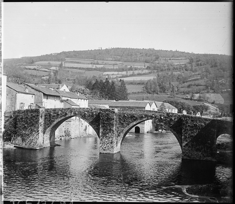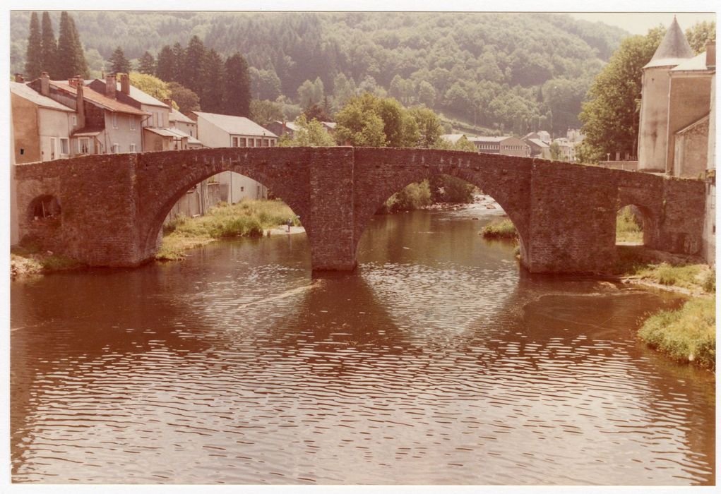La construction se situe au 12e ou au 13e siècle. A cette dernière époque, l'usage du pont de pierre à dos d'âne utilisant l'arc brisé se généralise. Un relevé de 1770 indique que le parapet était plus élevé et que, côté rive gauche, se trouvait une sorte d'octroi sur la dernière pile. En 1839-1840, un nouveau pont est bâti parallèlement mais il est emporté par une crue en 1861. En 1867, le vieux pont est restauré et acquiert son état actuel. £L'ouvrage de type médiéval à dos d'âne est composé de deux grandes arches ogivales, flanquées de deux petites arches de rive en plein cintre. Il est rythmé par trois piles épaisses, cantonnant les arches, débordant d'un mètre à l'extérieur. Ce débordement se poursuit jusqu'au niveau du parapet, formant refuge. La pile centrale est précédée d'un avant-bec triangulaire effilé. Des corbeaux de pierre ont été placés le long du parapet en 1867 pour supporter un garde-corps en bois qui donnait plus d'ampleur à la chaussée. De cette même époque datent les anneaux de fer destinés aux tringles sur lesquelles étaient pendus les draps qui sortaient du foulon.